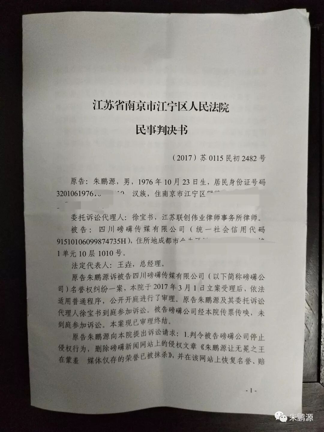 上诉人(一审原告):朱鹏源,男,生于1976年10月23日,汉族,中国新闻传媒集团总编辑,现住南京市江宁区。